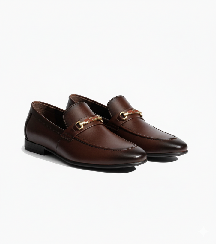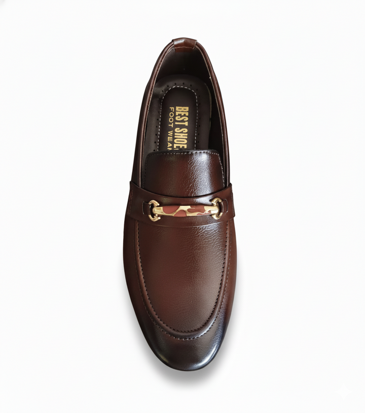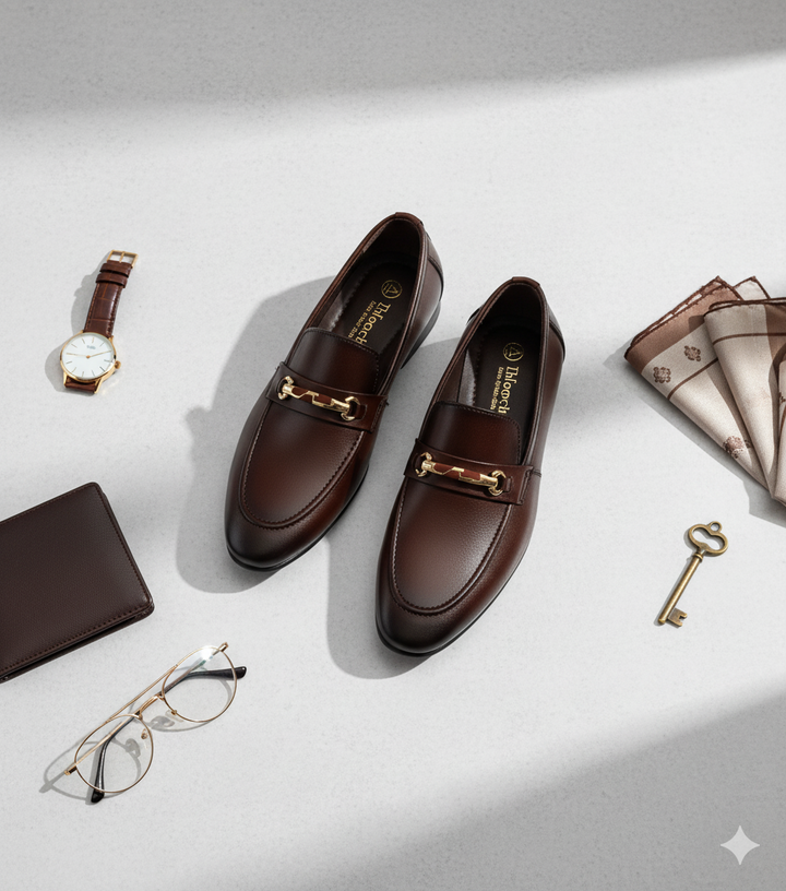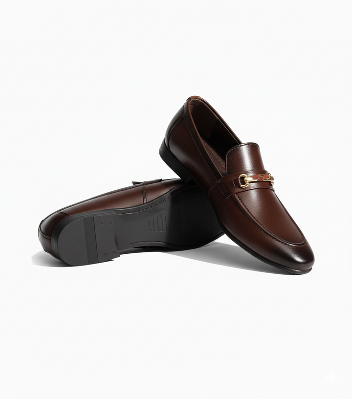 Step into luxury with the 👞 Handmade Brown Rexine Loafers with Gold Chain Strap, an exclusive collaboration between HS Shoes and Business Point Trader. Crafted from premium brown Rexsine with a rich, polished finish, these artisanal slip-on loafers feature a sleek rounded toe and a standout gold-tone metal strap with a unique chain-link design across the vamp for a bold, luxurious accent💼. The padded insole ensures all-day comfort, while the durable black rubber sole provides excellent traction and longevity ✂️. Handmade with meticulous craftsmanship, these premium men's loafers are perfect for formal occasions, business meetings, or semi-formal events, blending classic elegance with modern flair 🕒. Discover the SEO-friendly men's dress shoes ideal for office wear, weddings, and stylish outfits at HS Shoes x Business Point Trader 👞. Shop now for these handcrafted leather loafers that redefine sophistication! 🌐