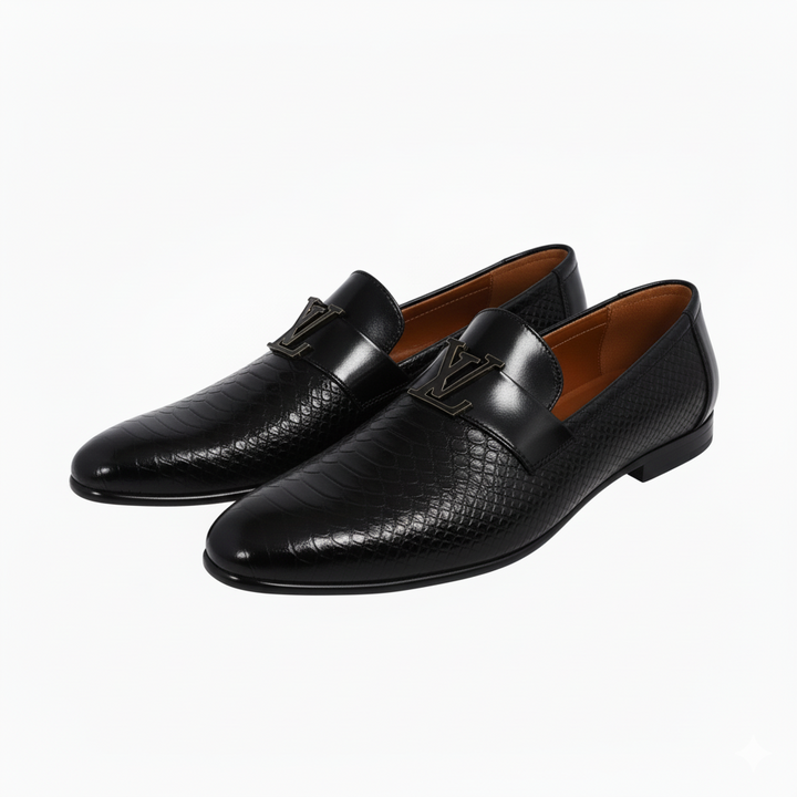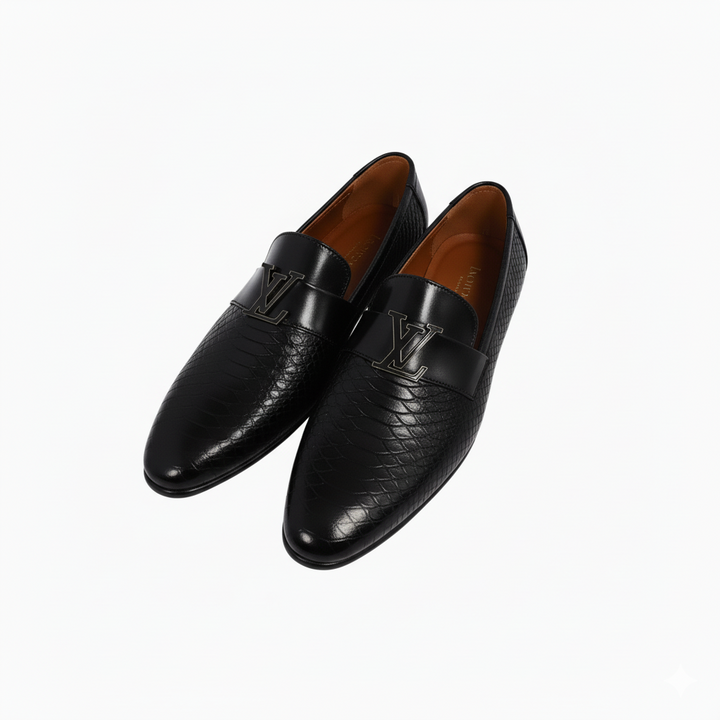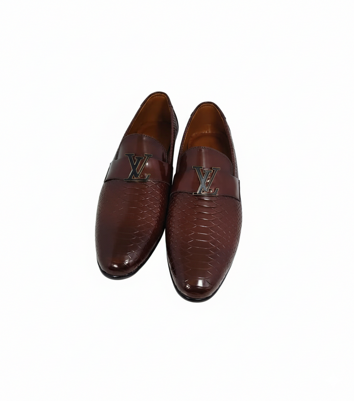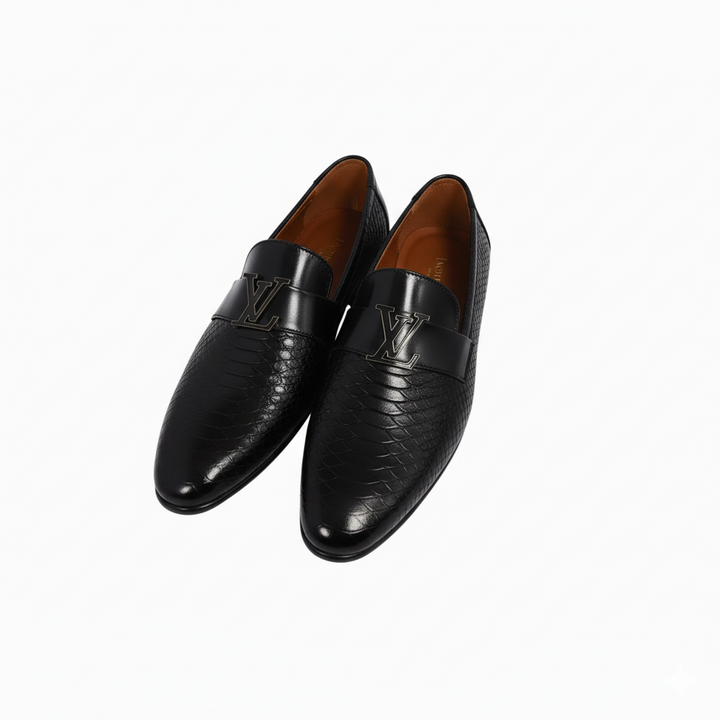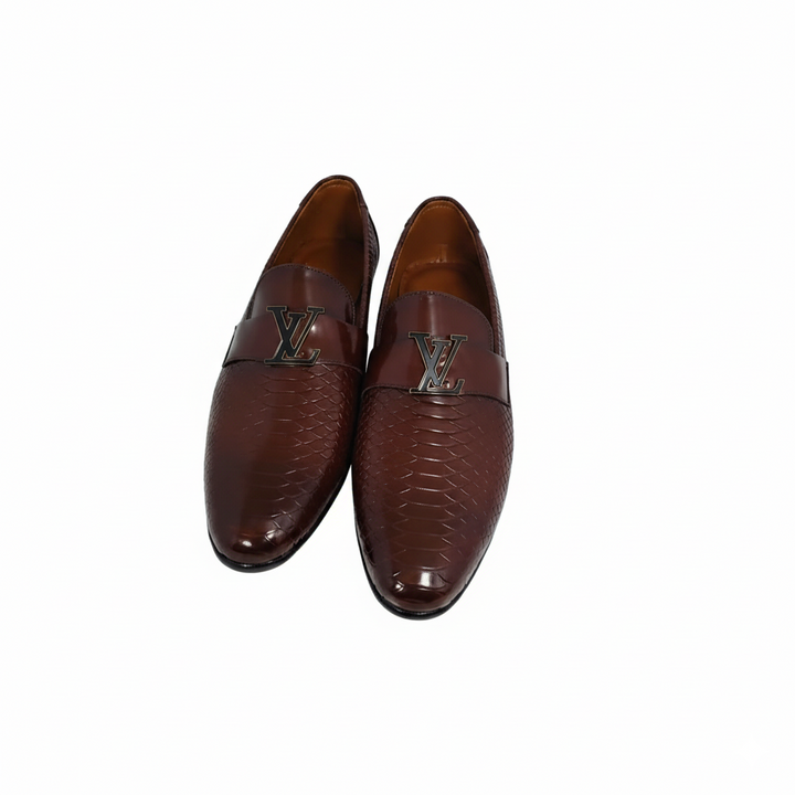 Elevate your style with the 🕴️ Brown Snakeskin Loafers with LV Accent, now available at Business Point Trader. Crafted from high-quality brown leather with a striking snakeskin texture, these slip-on dress shoes feature a polished finish and a rounded toe for a sophisticated look. The bold 🌟 "LV"-shaped metal accent on the vamp adds a unique statement, while the padded tan insole ensures all-day comfort 💼. Paired with a durable black leather sole, these premium men's loafers are perfect for formal events, business meetings, or semi-formal occasions ✂️. Enhance your professional wardrobe with these SEO-friendly men's dress shoes, ideal for office wear, weddings, and stylish outfits 🕒. Shop now at Business Point Trader for top-quality leather loafers that exude modern elegance! 👔