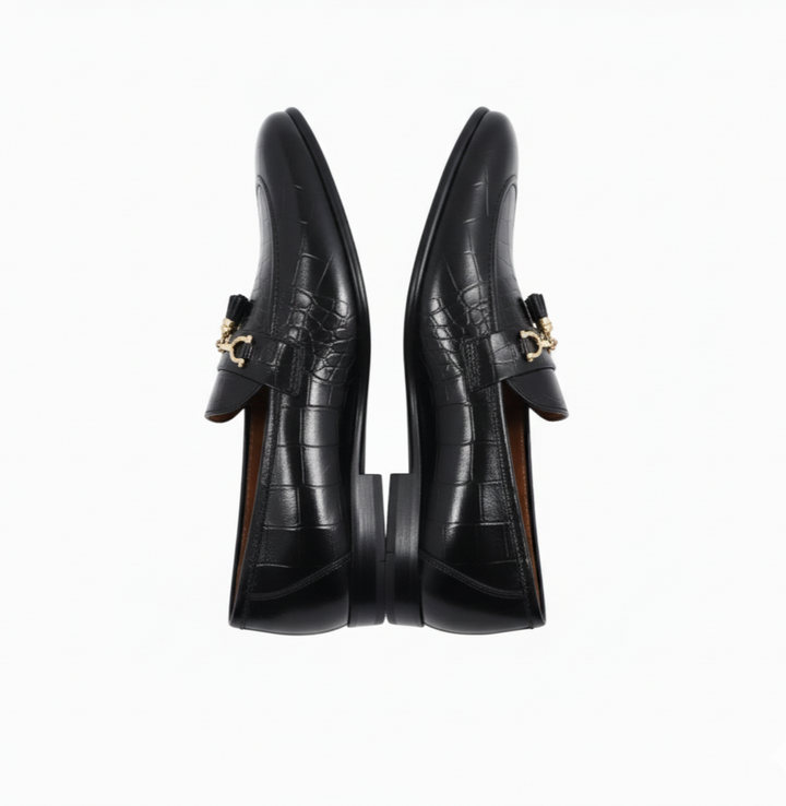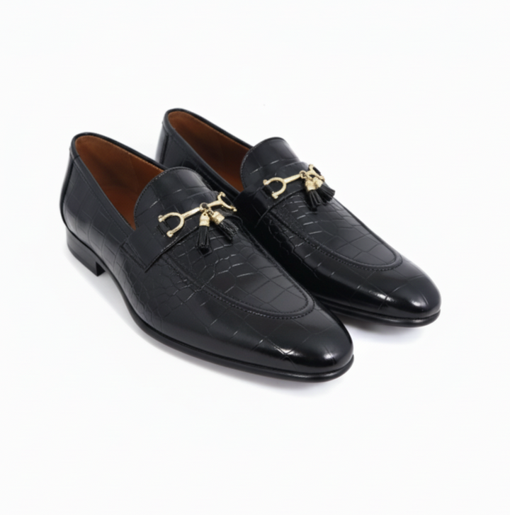 Unleash your inner elegance with the Business Point Trader x HS Shoes Crocodile Loafers with Tassels, a striking collaboration that redefines luxury footwear. Crafted from premium crocodile-textured black leather, these loafers feature a bold gold-tone metal bit with dangling tassels, perfect for making a statement at formal events, board meetings, or upscale outings. Designed with a cushioned insole, they offer all-day comfort without compromising style.